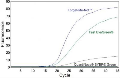 使用两种 EvaGreen® 预混液(Forget-Me-Not™ EvaGreen® 和 Fast EvaGreen®)和 QuantiNova SYBR® Green 进行的 qPCR 反应的原始荧光信号比较。EvaGreen® 染料比 SYBR® green 抑制性更小,信号更亮。