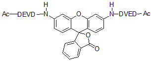 Ac-DEVD-R110 (Rhodamine 110, bis-(N-Ac-L-aspartyl-L-glutamyl-L-valyl-1-aspartic acid amide)) 是 caspase-3 的荧光底物,可用于连续测量使用荧光计或荧光酶标仪检测细胞提取物中 caspase-3 的活性。Ac-DEVD-R110 包含两个 DEVD 四肽,并在两个连续步骤中被 caspase-3/7 水解,释放绿色荧光染料罗丹明 110 (R110)。