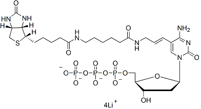 Biotin-11-dCTP(Biotin-11-2'-deoxycytidine-5'-triphosphate,四锂盐)可通过切口平移、随机引发或 3'-末端末端标记酶促掺入 DNA。数字 11 是生物素和 dCTP 之间的接头中的原子数。ween biotin and dCTP.