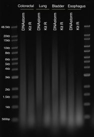 使用 DNAstorm™ FFPE 试剂盒和热门竞争对手的试剂盒从四种不同的 FFPE 肿瘤样本(结肠直肠、肺、膀胱和食道)中提取 DNA。上样等量 (500 ng) DNA 并在脉冲场凝胶上电泳。使用 DNAstorm™ 试剂盒可以显着改善平均 DNA 大小。“Kit R”代表具有竞争力的商业 DNA FFPE 提取试剂盒。