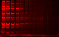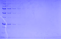 图 3. 使用 Lumitein™ 蛋白凝胶染料(左)和考马斯蓝(右)对含有经电泳分离的蛋白质标记物(从左到右以两倍连续稀释加载)的 PAGE 凝胶进行染色。Lumitein™ 染色凝胶使用配备 EtBr 滤光片 (UVP) 的 UV 盒成像,而考马斯染色凝胶使用白光转换器 (UVP) 成像。 |
