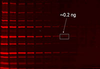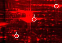 图 1. 通过 SDS-PAGE 分离两倍连续稀释的蛋白质标记物,然后用 Lumitein™ 染色。使用 532 nm 激发和 610BP30 发射滤光片使用 GE Typhoon Trio 成像。 | 图 2. 用 Lumitein™ 染色的人肝蛋白裂解物的二维凝胶。Applied Biomics, Inc. (Hayward, CA) 挑选了三个圆圈点进行 MS 分析,证实 Lumitein™ 染色与 MS 分析完全兼容。 | |