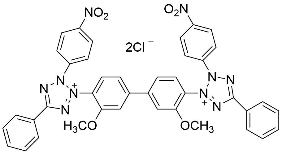 NBT (Nitro blue tetrazolium, chloride) 是一种氧化剂,广泛与 BCIP 或 BCIP 衍生物结合使用以检测磷酸酶活性。NBT 也是脱氢和其他氧化物的底物。因此,它通常用于评估细胞活力、增殖和细胞毒性,也经常用于组织化学研究。无色NBT溶于水,但酶还原后形成深蓝色、高度不溶的沉淀。