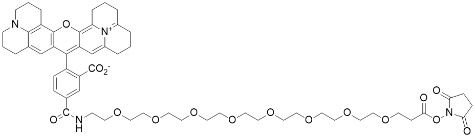 5-ROX-PEO 8 SE(全名:5-Carboxy-X-rhodamine-PEO 8 -propionate, succinimidyl ester)具有约 32 埃的水溶性 PEG 间隔基,可将红色荧光 ROX 染料和胺反应性 SE 分开团体。