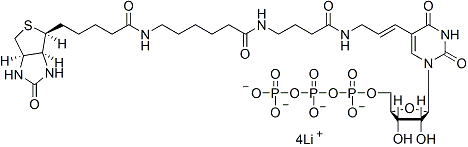 Biotin-16-UTP(Biotin-16-uridine-5'-triphosphate,四锂盐)可以酶促掺入 RNA。数字 16 表示生物素和 UTP 之间的碳数。